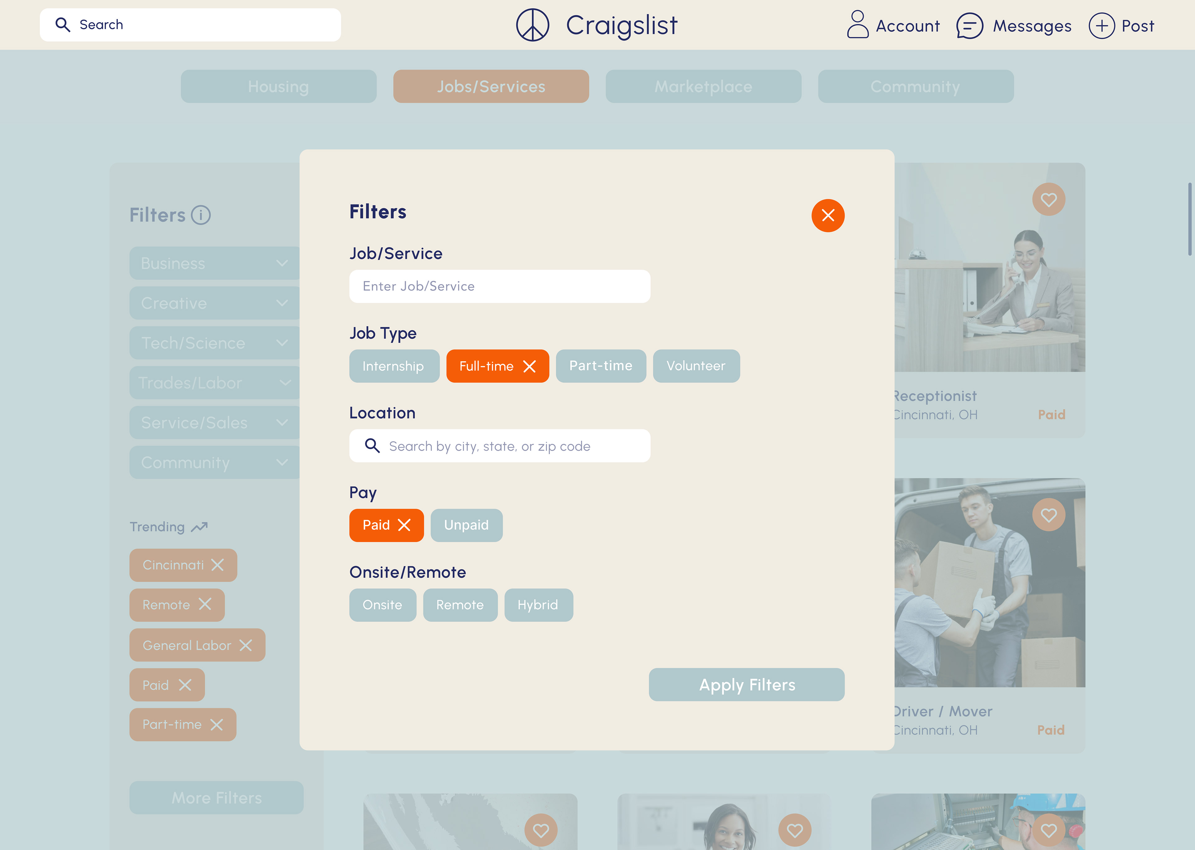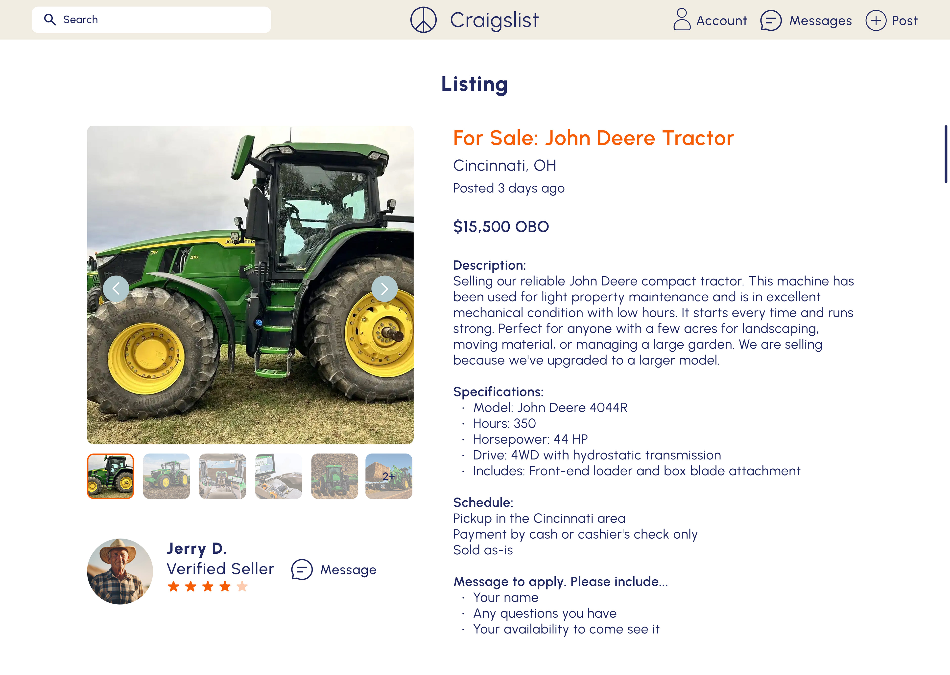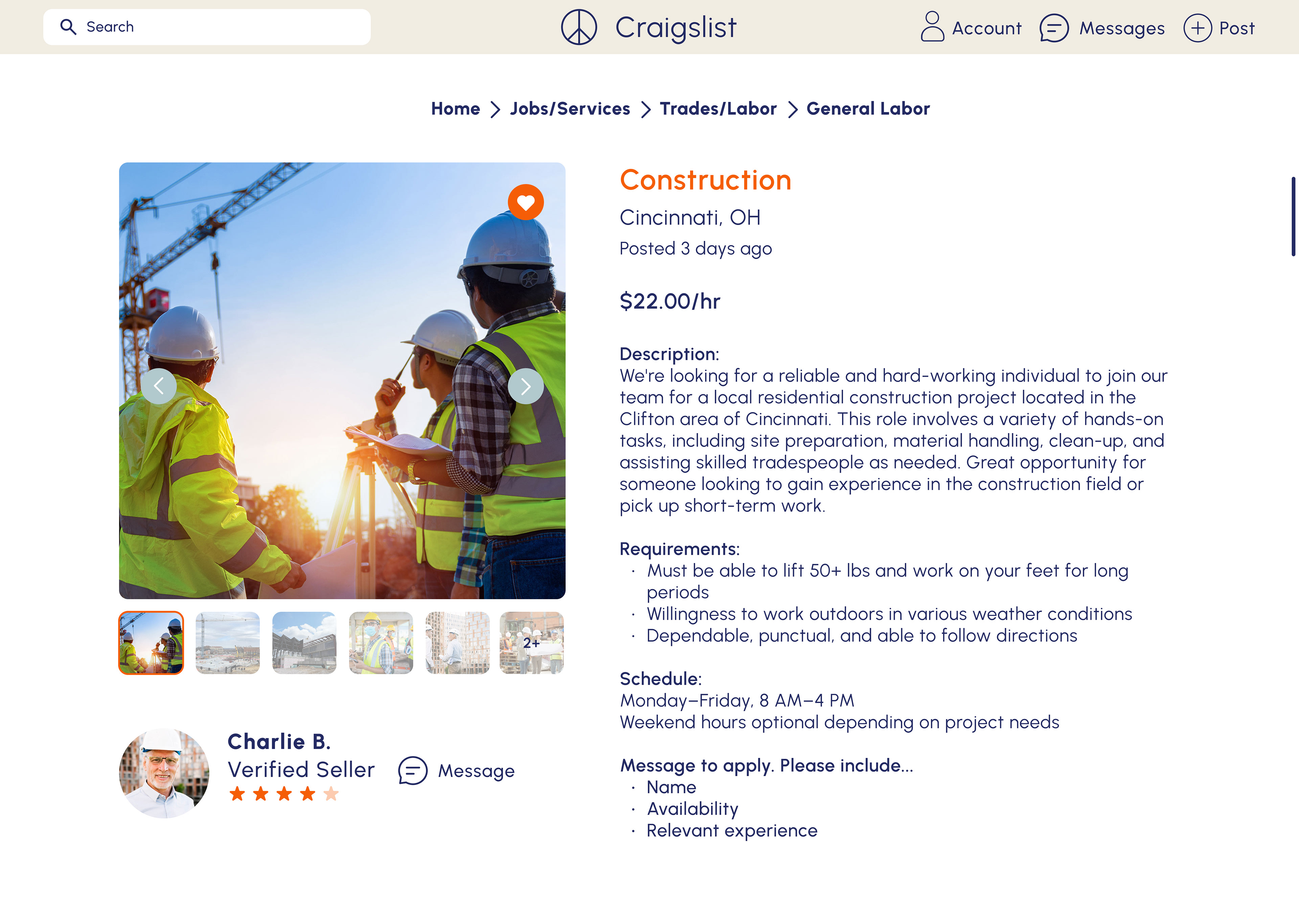 Redesigned Craigslist to create a more trustworthy and accessible interface that appeals to a broad audience. The project focused on enhancing usability and navigation across devices while maintaining the familiar browsing and posting experience. Through modern UI principles, a cleaner layout, and improved visual hierarchy, the design reduces information overload, strengthens user confidence, and improves discoverability and interaction within a responsive, consistent framework.