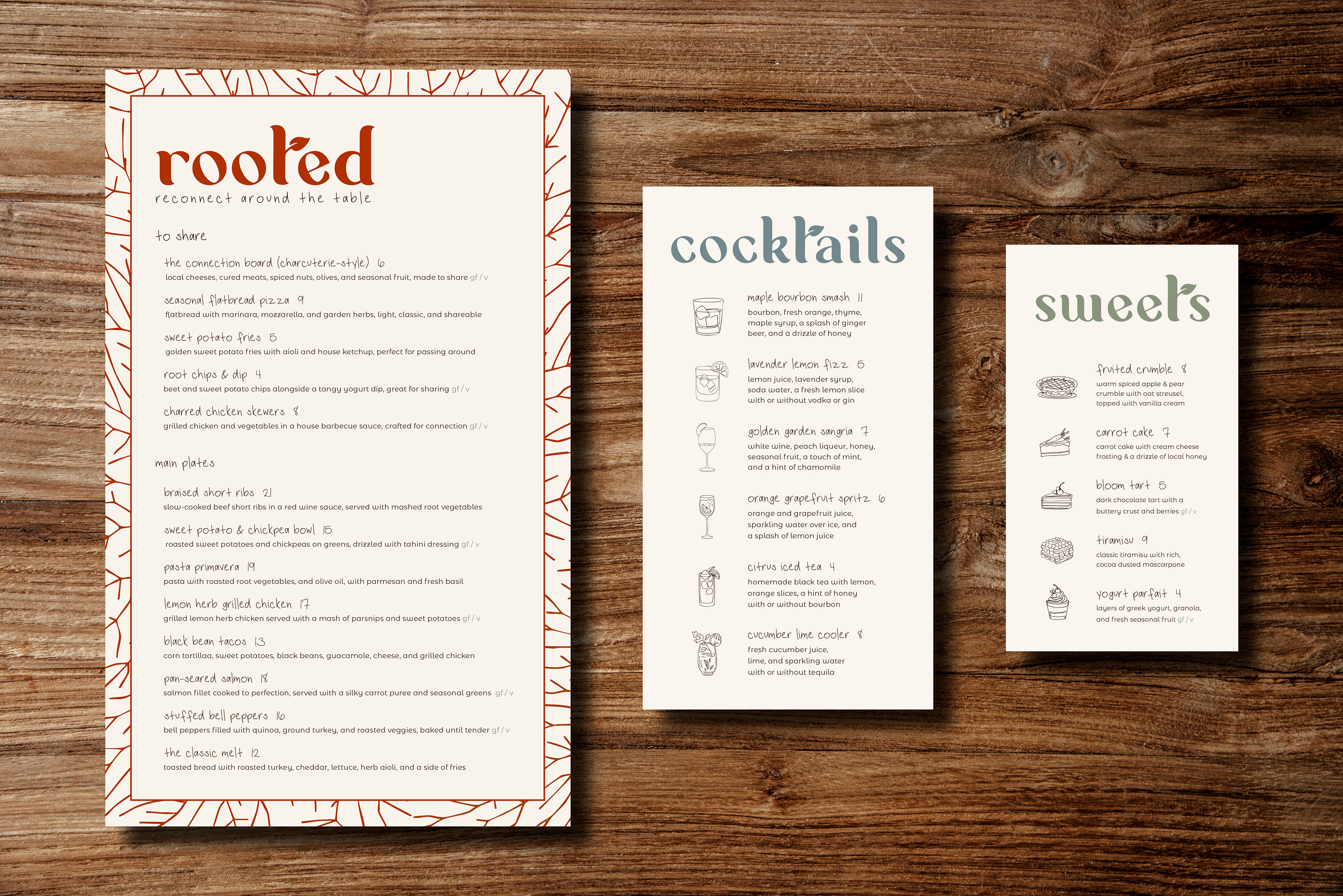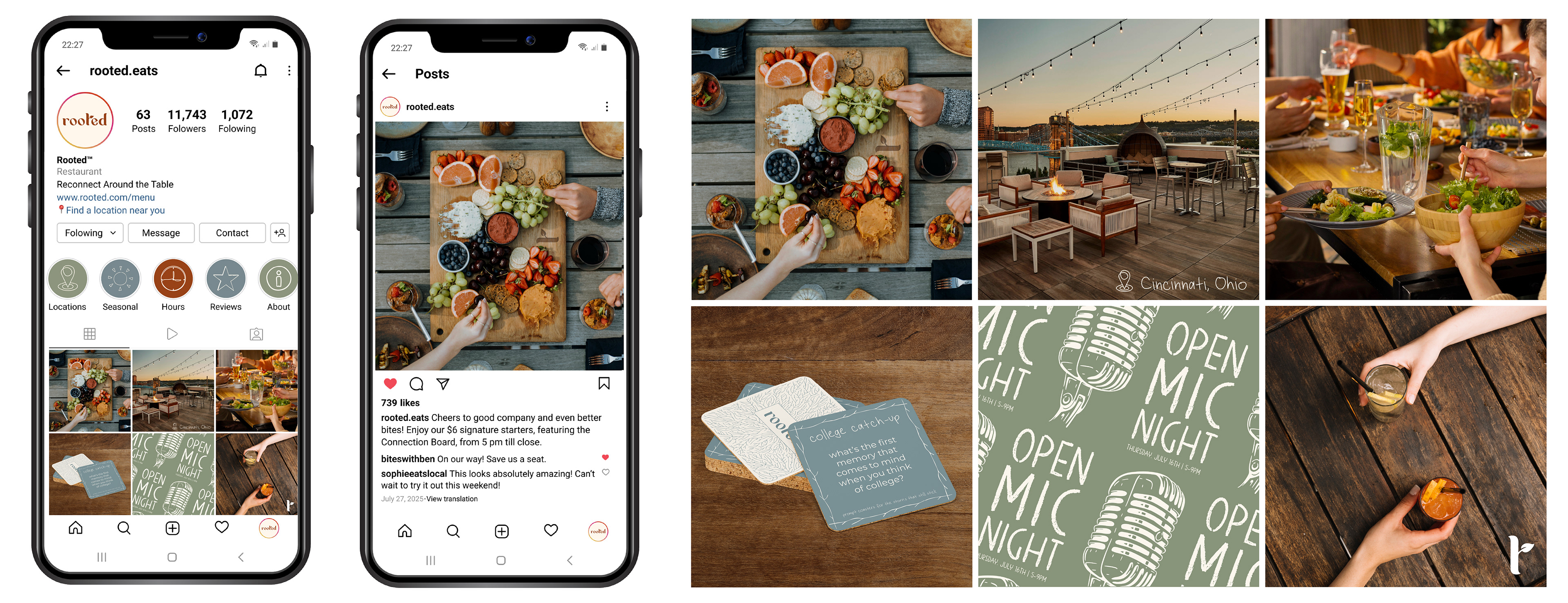 Three menus were designed to reflect Rooted’s values of simplicity and mindfulness through clean typography and organic textures. A cohesive Instagram page and branded posts were also created to capture the restaurant’s calm, inviting atmosphere and encourage guests to slow down and reconnect.